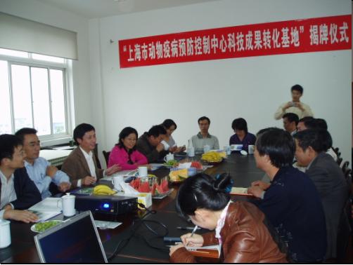 2008年10月26日下午4时,在我厂区内隆重举行了“上海市动物疫病预防控制中心科技成果转化基地”揭牌仪式。我厂顾岳明董事长致词,并向各位领导、专家介绍了我厂概况,同时对上海市动物疫病预防控制中心选择我厂作为科技成果转化基地而深表感谢。合作双方分别就合作的具体事宜交换了意见和建议。上海市政协常委、上海市疫控中心主任李建颖和我厂董事长顾岳明共同揭牌。到会的领导有上海市兽药饲料检测所沈书记、王所长、黄所长以及顾主任等。