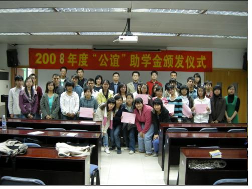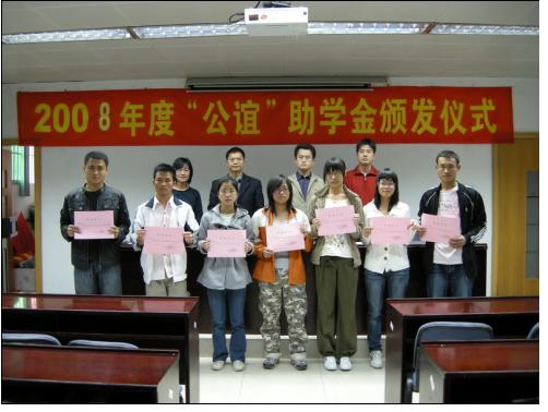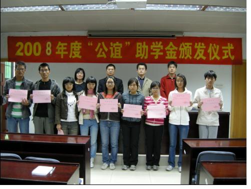 冬意渐浓,12月3日的华南农业大学“农业部兽药残留检测中心”101会议室却充满了温暖的气息。下午4点半,兽医学院2008年度“公谊”助学金颁发仪式正式拉开序幕。学院党委刘红斌副书记,学院团委书记、辅导员陈晓梅老师,辅导员贾伟新老师,研究生团总支书记陈裕华出席了本次仪式。颁奖仪式由陈晓梅老师主持。